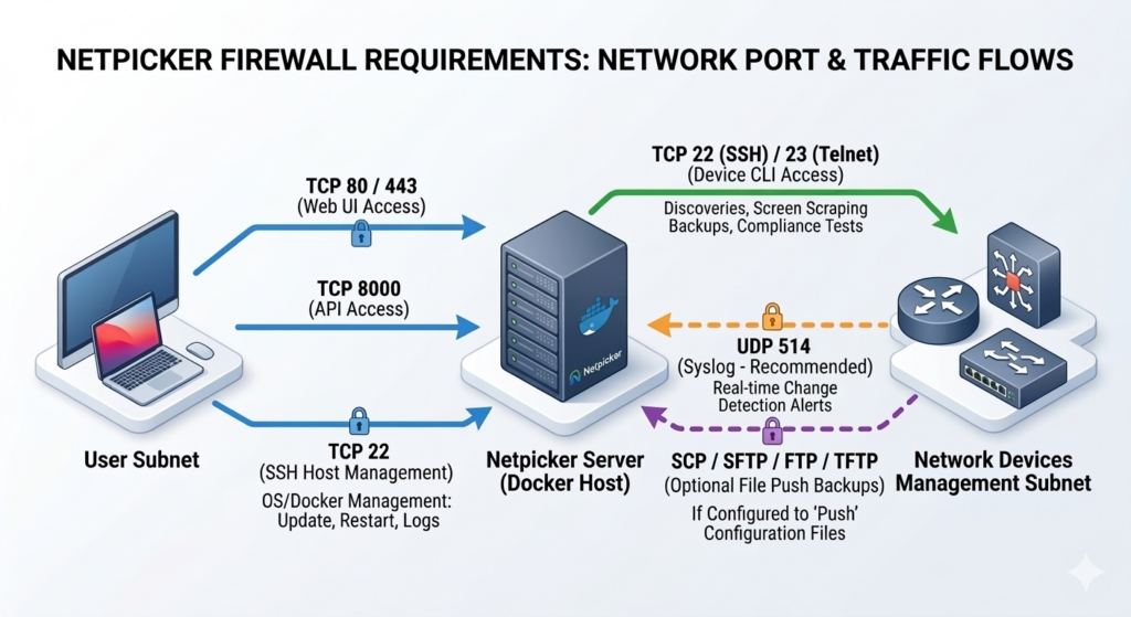 | Configuration Backup File Transfer | SCP / SFTP / FTP / TFTP | Network Devices Management Subnet | Netpicker Server | ⚙️ Optional |