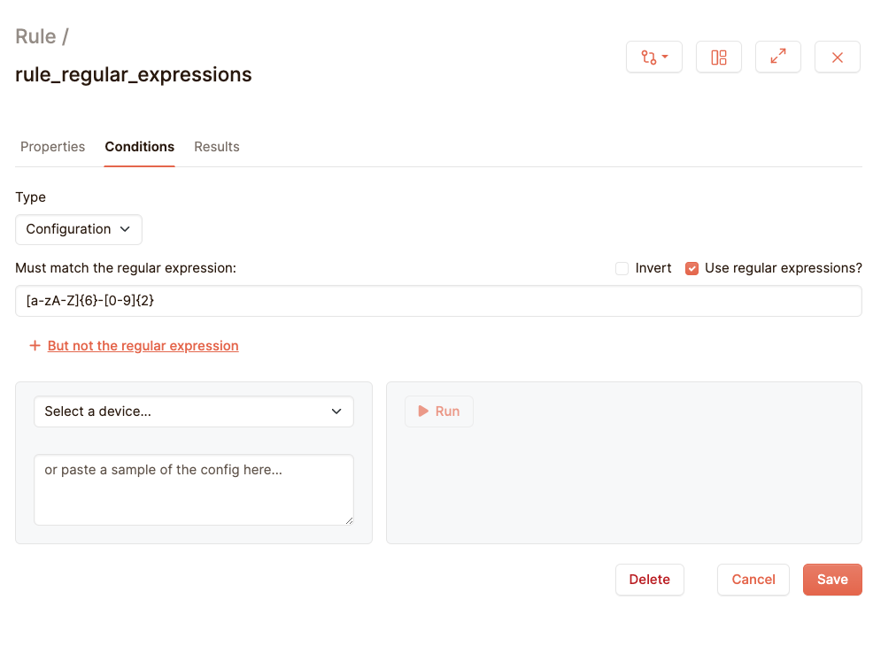 Suppose that you require all your devices to have hostnames that follow a same pattern. For example, they should first have six letters, followed by a dash and then followed by two numbers, and you want to validate that the hostname defined within your configuration follows these constraints. For this you can use the regular expressions option: