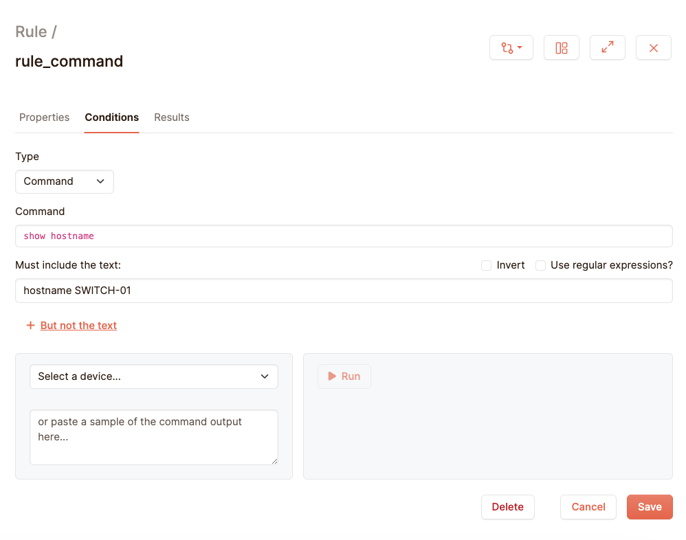 Let’s say we want to validate that the output of ‘show hostname’ is indeed ‘SWITCH-01. For this you need the Type field of the rule form. By default it is configuration, but for this example we want to switch it to ‘command’: