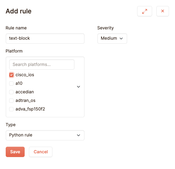 This is the most basic use case. Suppose you have a Cisco IOS device and you want to check its version. The version is defined on a single line in the configuration, so we need a simple rule with nothing extras. Go to the policies section, click on your policy and create a Simple rule for the Cisco IOS platform: