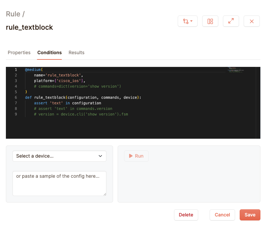 In this example we restrict ourselves to only two devices, with a single interface, but you can easily extend this rule so that it checks for four devices, all running on the same configuration. By using the right show commands, you can check against every interface and vlan, allowing you to validate every aspect of your devices.