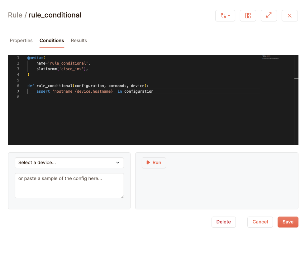 In real life, you’d want to make this a bit more generic. Here is a test that checks for every Cisco IOS device if its configuration contains the hostname as defined in Netpicker: