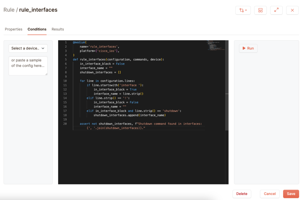 So for our rule, we need to loop over every configuration block. And for each of the blocks, we need check if it doesn’t contain the word ‘shutdown’. This is how you can tackle it: