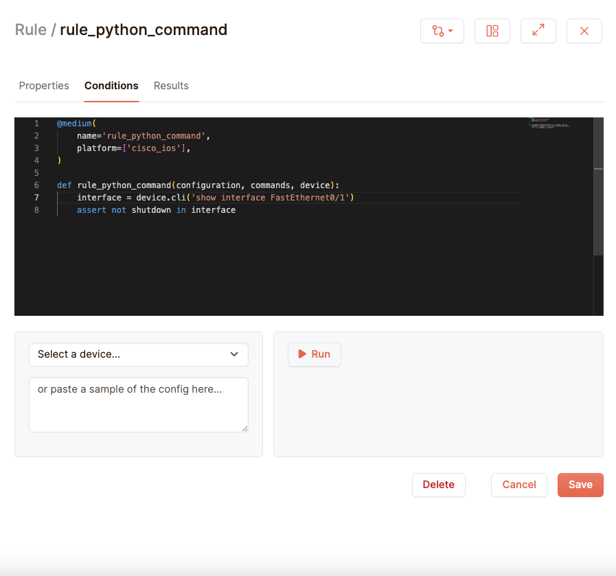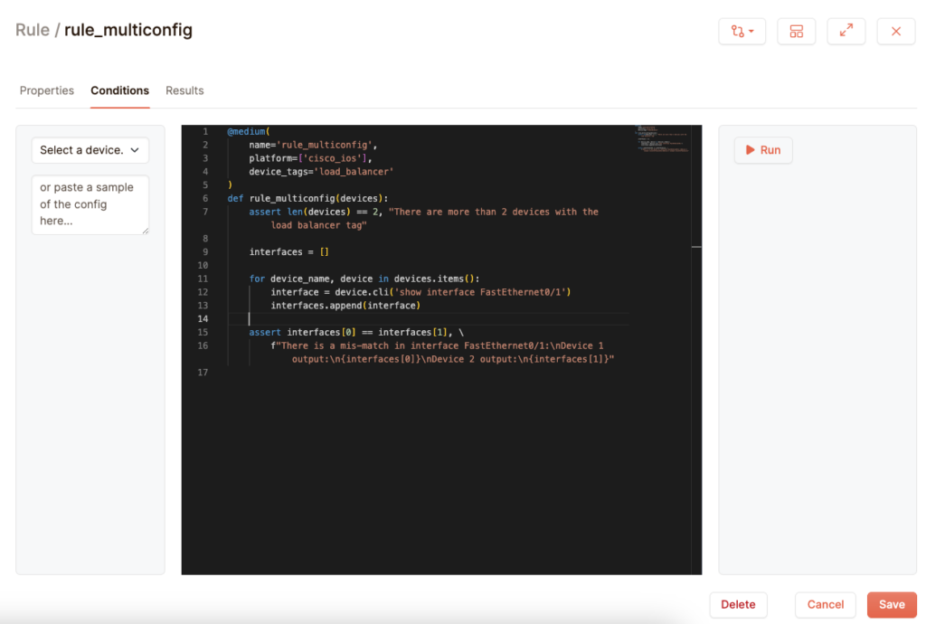 Netpicker’s python tests also allow you to use the configurations of multiple devices. Suppose you have two Cisco IOS devices that need to be redundant. For the sake of example, let us verify that their interface FastEthernet0/1 settings match each other. This is the rule that can do that for you: