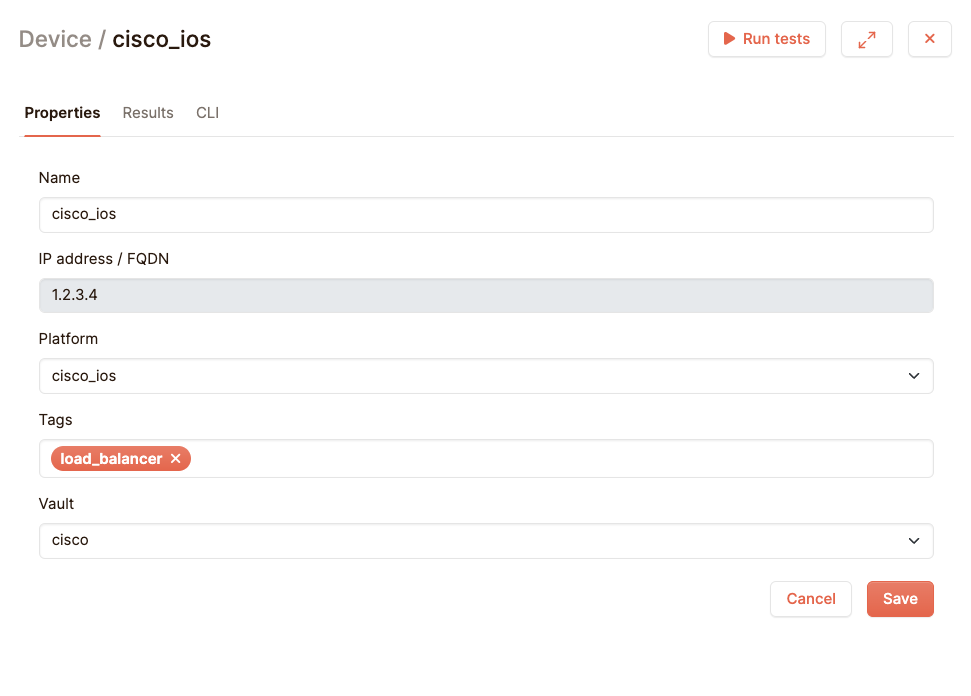 What you see here is an extra argument called device_tags. This tells netpicker to only perform this test on devices that have the device tag of “load_balancer”. You can set these tags in the device form: